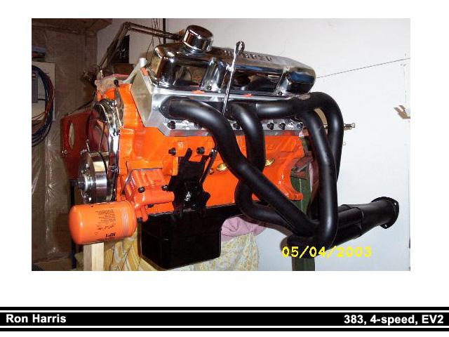It is an original 383 4 speed EV2 Hemi-Orange , Airgrabber car. I still have the original numbers matching engine but now a 440/496 Muscle Motors Stroker is in it. Edelbrock heads, Edelbrock TM-7 manifold, Comp cams solid cam and roller rockers. That's just a few of the engine details, I estimate 550 + hp. I did want to go with the Mopar Performance crate 500/575 engine but decided to go this route instead. The original 4-speed is still in it with not one problem in all these years. I have a Mcleod clutch.